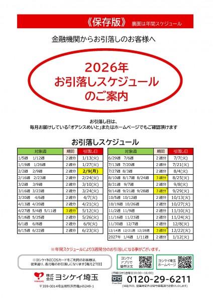 金融機関お引落しをご利用のお客様へ、お引落しスケジュールをお知らせいたします。ご利用口座へは、前営業日中にご入金いただけますようお願い申し上げます。