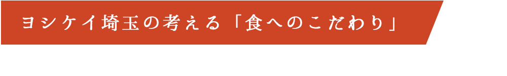 ヨシケイ埼玉の目指すところは、当たり前に良い商品をお届けする会社です。食品の安全性について一層意識が高まっている昨今、大事な事は良い 食材を仕入れる努力と、どんな情報でも包み隠すことのない誠実さだと考えます。こだわり素材の探求を続け、有機食品をはじめとする、安心・ 安全な食品づくりに真面目に取り組む生産者・加工業者との絆を大切にする。さらに自社にとって不利な情報でも一切を開示する姿勢を以って、 今後とも揺るぎない安心感と信頼のある食材の提供に努めて参りたいと考えております。